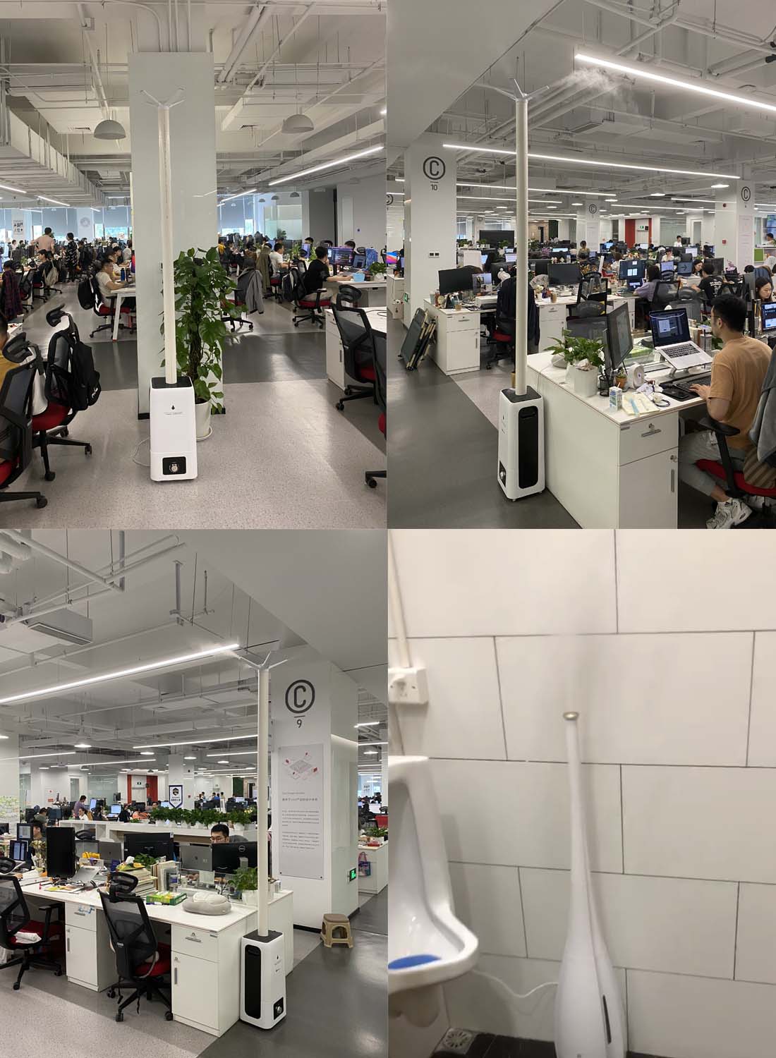 有贊科技由于扁平式架構,所有的員工都在同一個大型寫字樓里集中辦公,由于空間密閉并且人員非常集中,造成空氣質量差,空氣中病菌也很多,所以在其辦公區域內部署了大量的空氣霧化器+空氣凈化片,有效吸收空氣中的不良氣體并且起到了殺菌作用,從而大大的改善空氣質量。同時在其衛生間也布置了霧化器+空氣凈化片解決其臭味和細菌的問題。